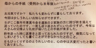 被害者のYさんの父親とも文通をしており、刑務作業の給料の一部を遺族への賠償金に送ったりしていることがわかりました。